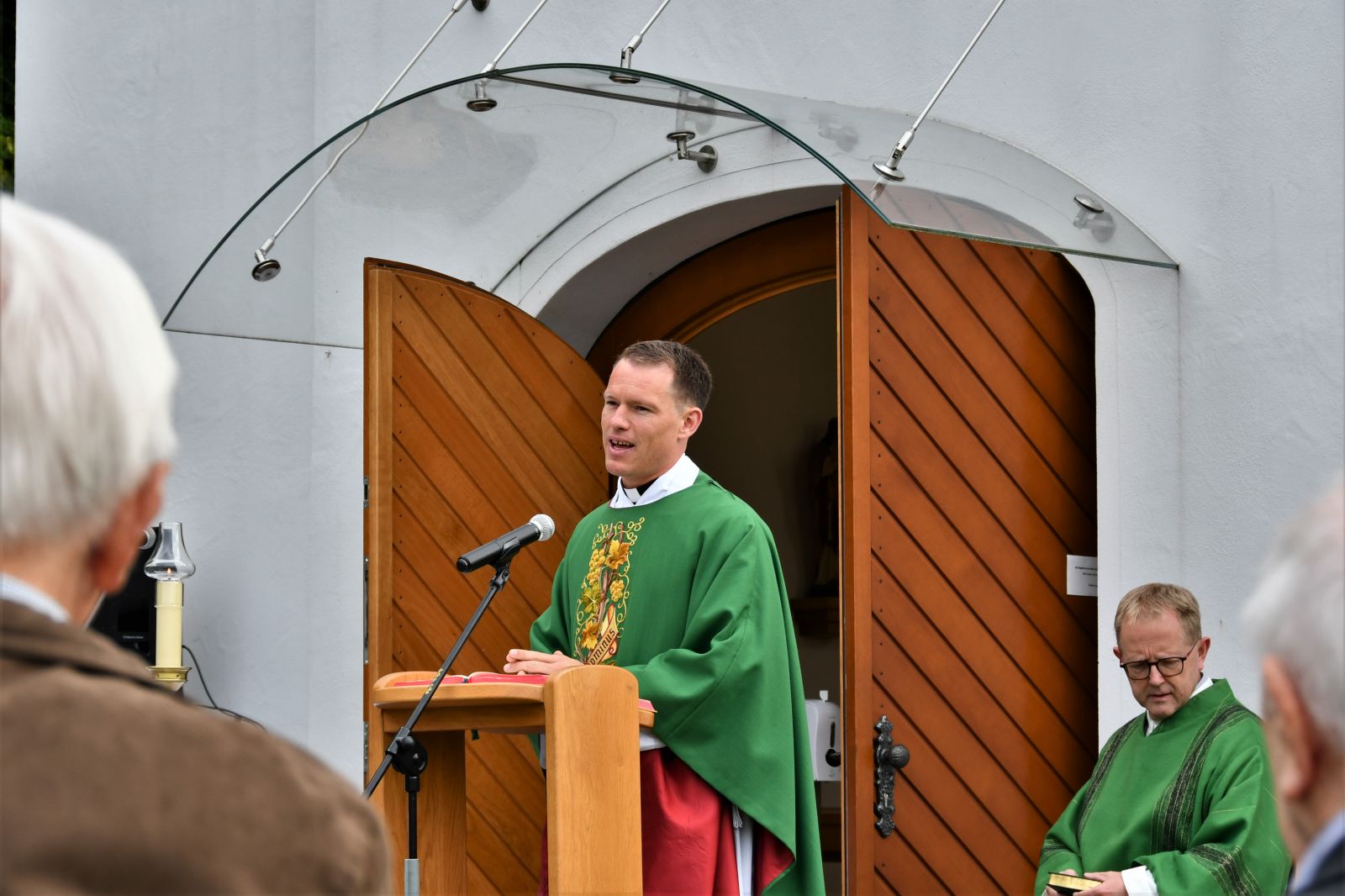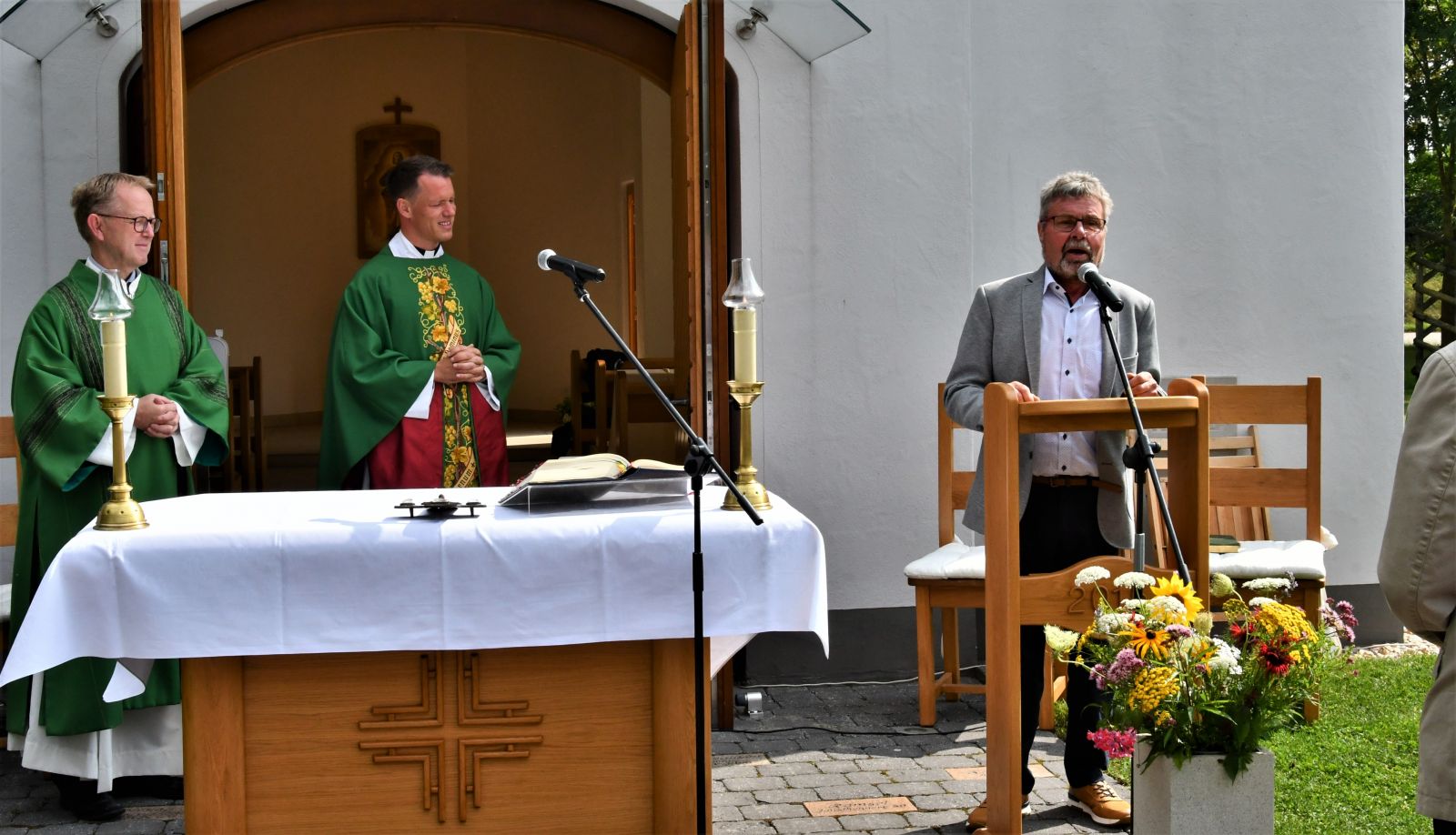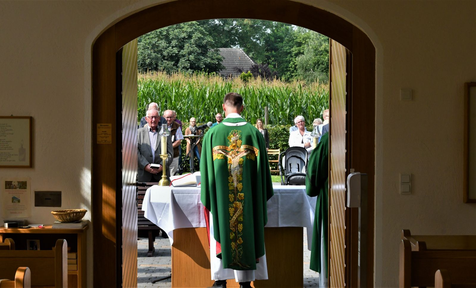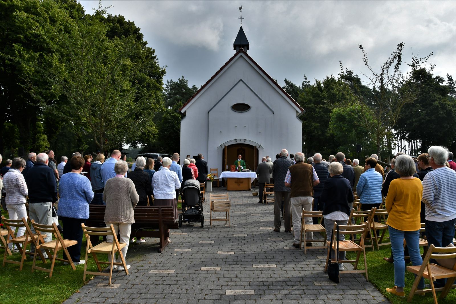 Dieser Einladung folgten ca. 150 Personen. Bei trockenem und teilweise sonnigem Wetter zelebrierte Vikar Lukas Hellekes den Gottesdienst im Freien vor der Kapelle.