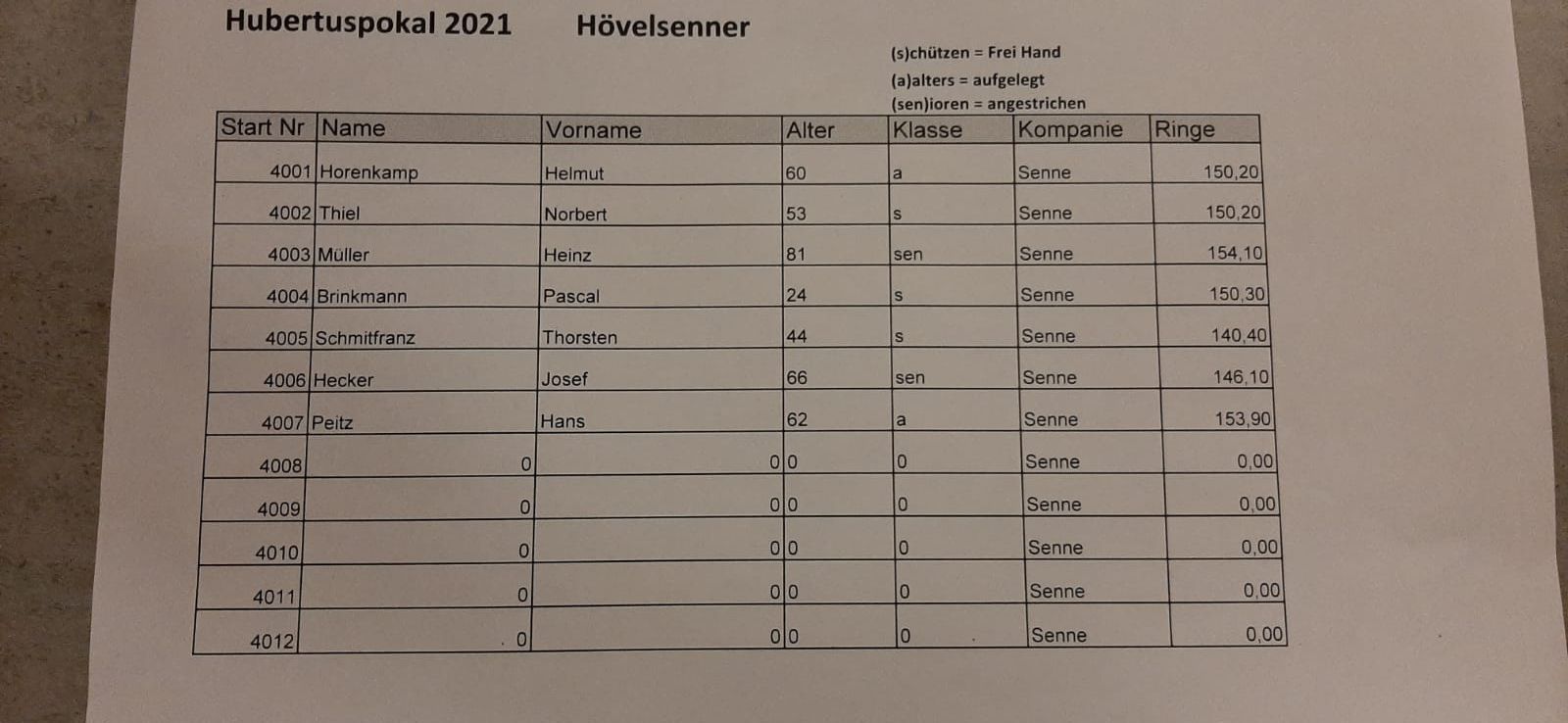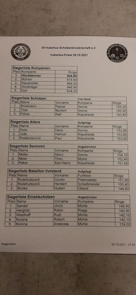 Im Anschluss an die Hubertusmesse sprachen unser Kompaniechef Benno Bröckling und Oberst Hubert Bonke noch einige Begrüßungsworte. Hubert gab dann traditionell die Ergebnisse des Hubertusschiessens vom 29. Oktober 2021 bekannt. In diesem Jahr konnten erfreulicherweise die Schützen unserer Hövelsenner Kompanie wieder die Kompanie-Mannschaftswertung vor der Mühlenkompanie für sich entscheiden. Auch in den Einzelwertungen erzielte die Hövelsenner Kompanie gute bis hervorragende Ergebnisse. Die Hövelsenner Kompanie wünscht an dieser Stelle herzlichen Glückwunsch zu den erzielten Ergebnissen!