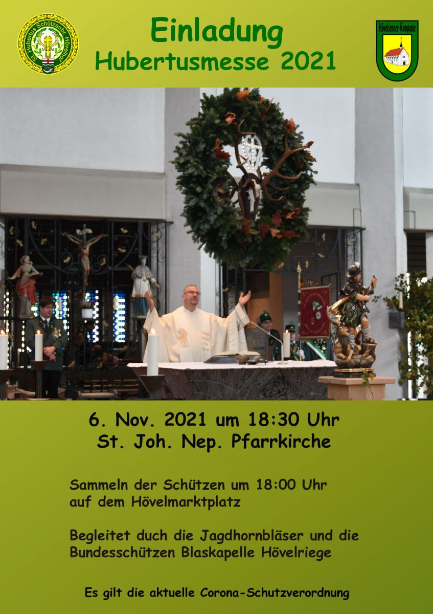 Am Samstag, 06. November 2021 fand zum 64. Mal die von der Hövelsenner Kompanie organisierte Hubertusmesse statt. Da aufgrund der Corona-Pandemie nur eine begrenzte Platzzahl in der Hövelhofer Pfarrkirche zulässig ist, wurde die Hubertusmesse, die traditionell immer sonntags stattfindet, auf den Samstag, 18.30 Uhr als zusätzliche Messe verlegt.
