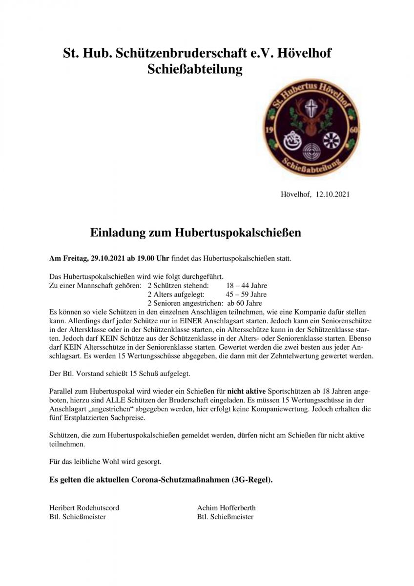 Einladung zum Hubertuspokalschießen am Freitag, 29.10.2021