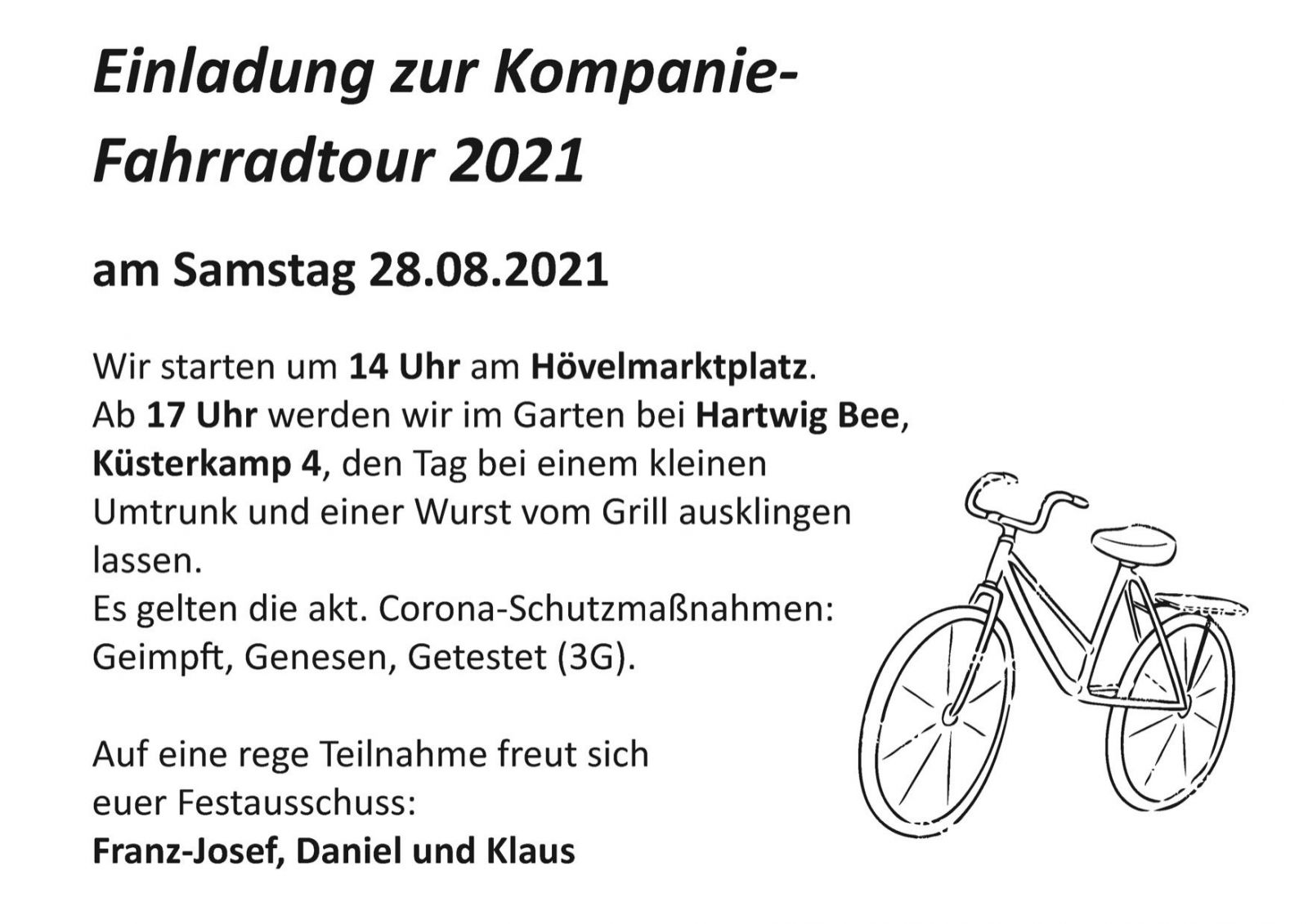 Am Samstag, 28.08.2021 fand nach einjähriger Unterbrechung wieder die Radtour der Hövelsenner Kompanie statt.