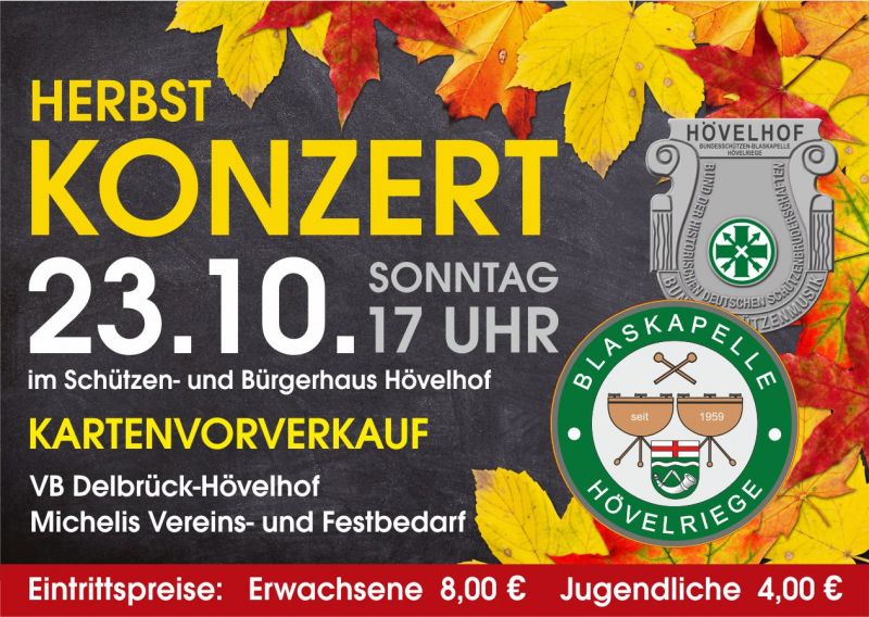 Eintrittskarten für das Herbstkonzert gibt es zum Preis von 8 € bzw. 4 € für 6-18 Jährige bereits im Vorverkauf in den Geschäftsstellen der Volksbank Delbrück-Hövelhof eG in Hövelhof und Riege sowie bei Vereins- und Festbedarf Michelis. Restkarten sind dann noch an der Tageskasse erhältlich