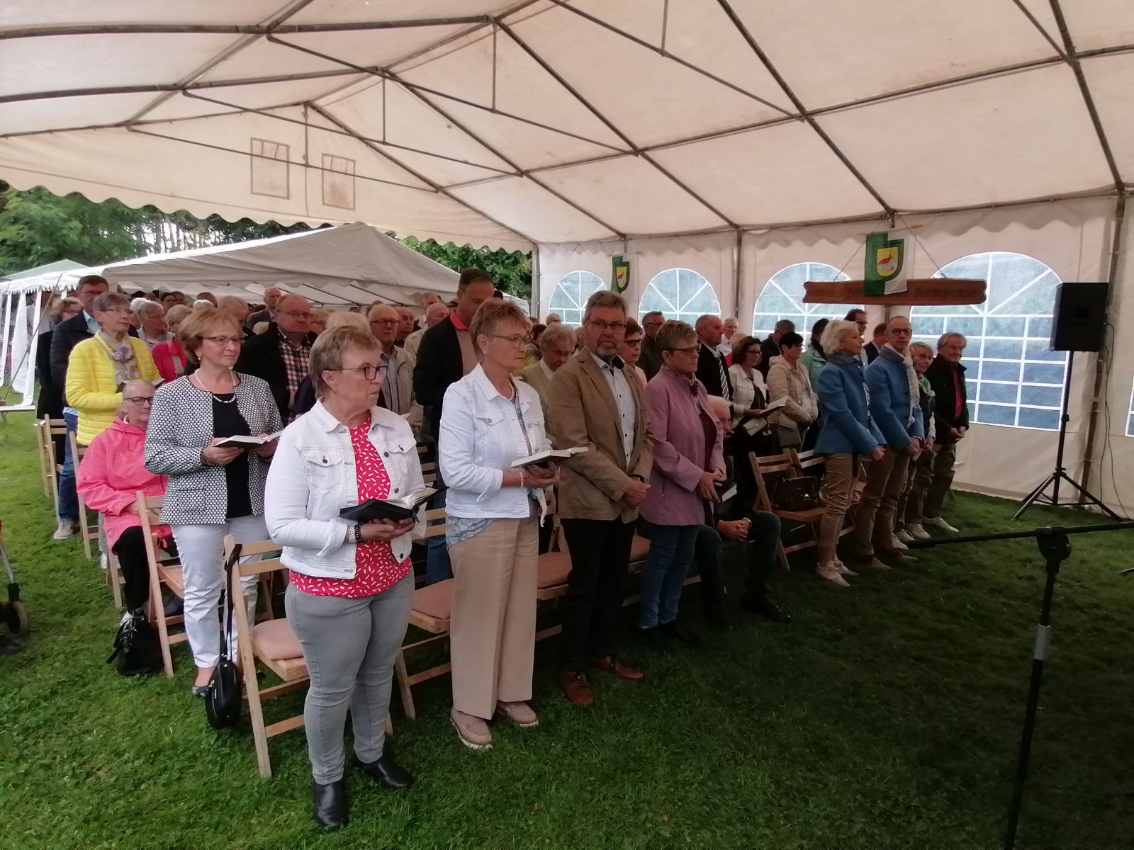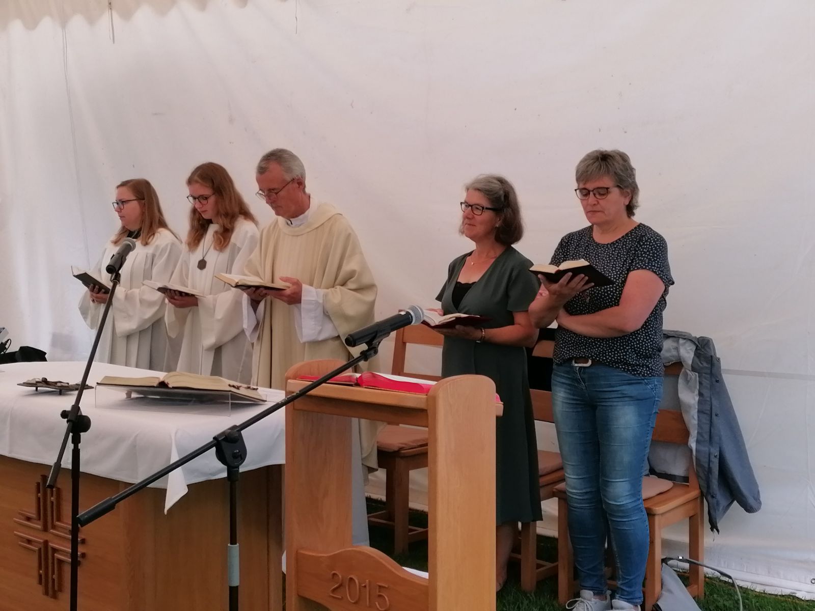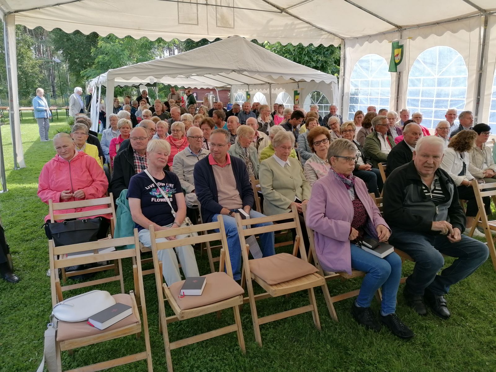 Es begann in diesem Jahr um 10:30 Uhr mit der von Pfarrer i. R. Peter Gede zelebrierten Festmesse im Kompaniezelt vor der Kapelle. Denn die Wetterprognosen waren alles andere als sommerlich.