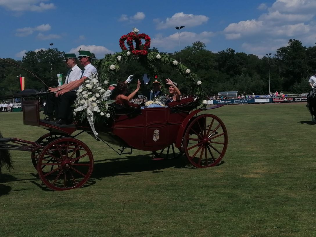 Am Schützenplatz angetreten wurden erneut zur Parade die Prinzenpaare und das Kaiserpaar in geschmückten Kutschen aufgefahren.
